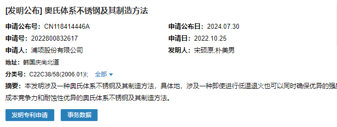 2024年7月30日,浦项股份有限公司成功申请一项名为“奥氏体系不锈钢及其制造方法”专利,申请公布号为CN118414446A,申请日期为2022年10月25日。
