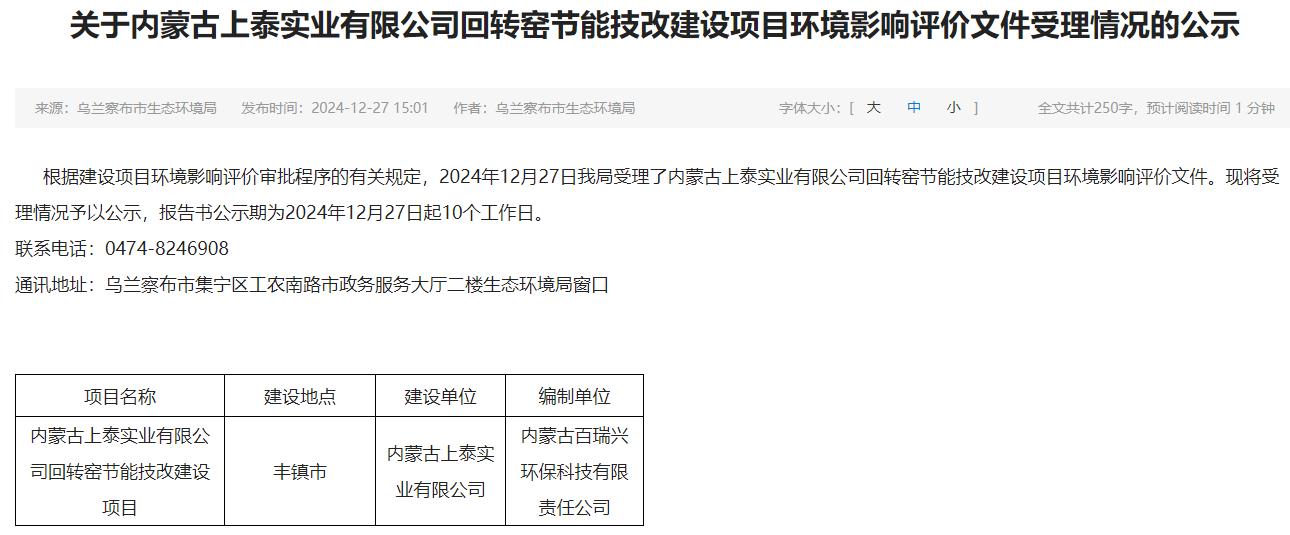 2024年12月27日,乌兰察布市生态环境局受理内蒙古上泰实业有限公司回转窑节能技改建设项目环境影响评价文件并对外进行公示,公示期为2024年12月27日起10个工作日。