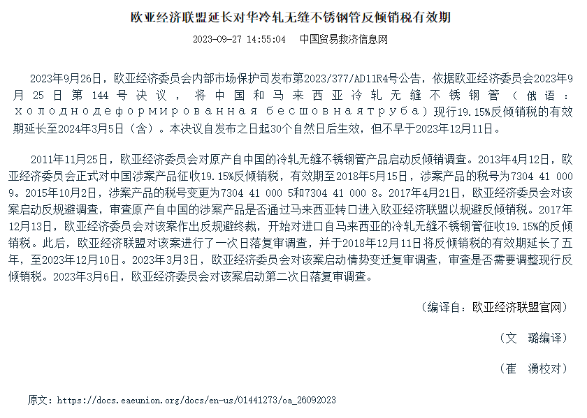 9月28日,据中国贸易救济信息网一则公告《欧亚经济联盟延长对华冷轧无缝不锈钢管反倾销税有效期》称,“2023年9月26日,欧亚经济委员会内部市场保护司发布第2023/377/AD11R4号公告,依据欧亚经济委员会2023年9月25日第144号决议,将中国和马来西亚冷轧无缝不锈钢管现行19.15%反倾销税的有效期延长至2024年3月5日(含)。本决议自发布之日起30个自然日后生效,但不早于2023年12月11日。”