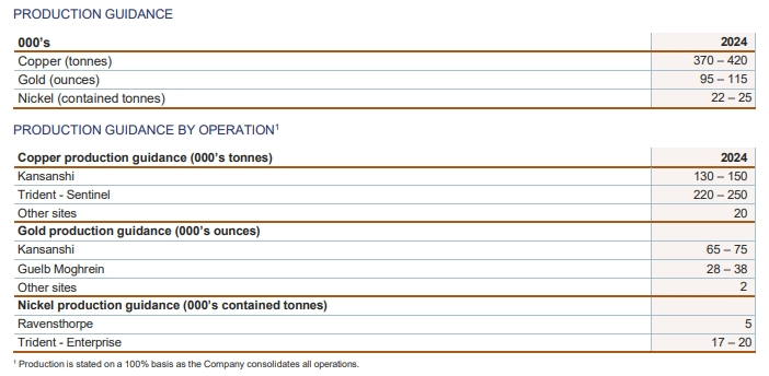 公司维持全年铜产量370,000至420,000吨、黄金产量95,000至115,000盎司的生产指导,镍产量指导则调整为22,000至25,000吨。