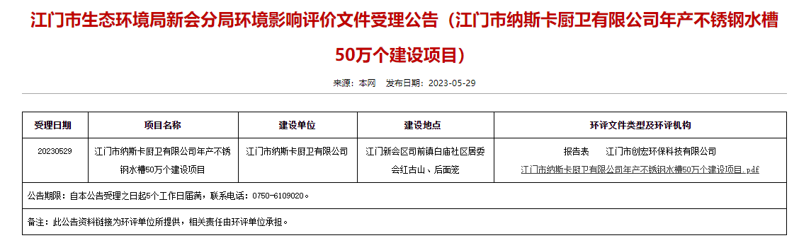 5月29日,江门市生态环境局新会分局受理江门市纳斯卡厨卫有限公司年产不锈钢水槽50万个建设项目环境影响评价文件并对外进行公告,公告期:5个工作日。