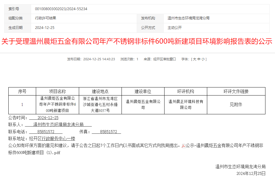 2024年12月25日,温州市生态环境局龙湾分局受理温州晨炬五金有限公司年产不锈钢非标件600吨新建项目环境影响报告表并对外进行公示,公示期:7个工作日。