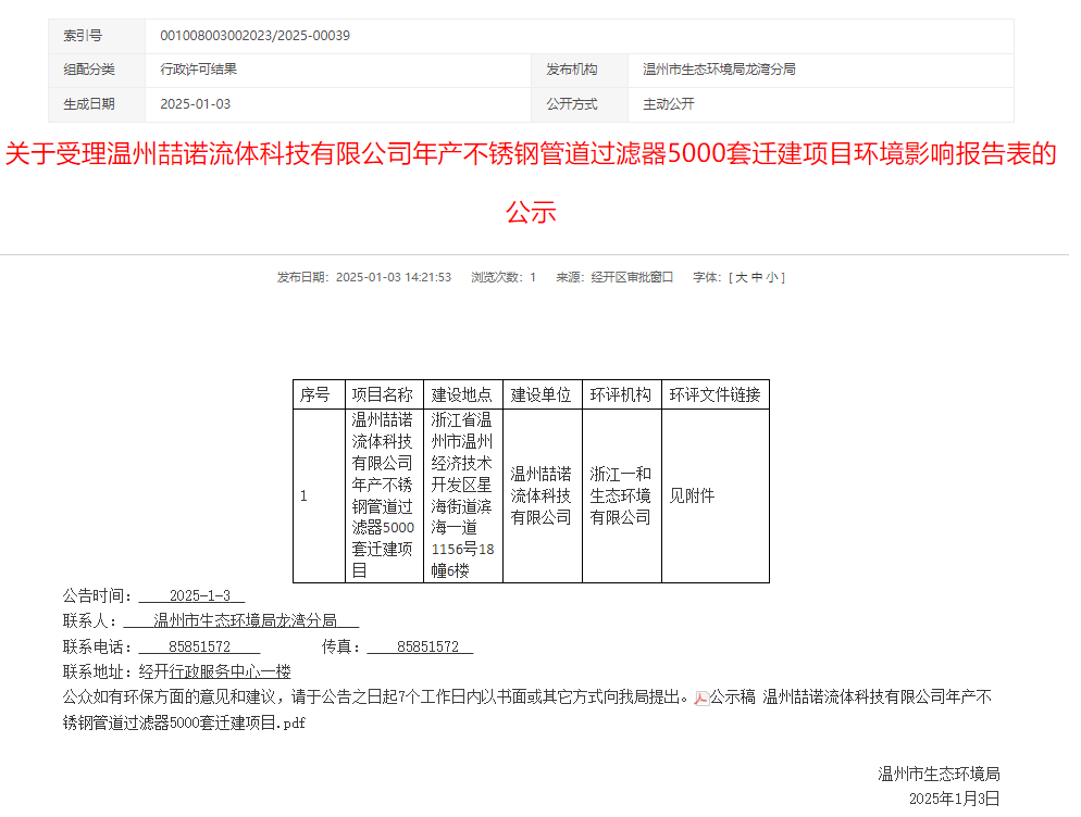 2025年1月3日,温州市生态环境局龙湾分局受理温州喆诺流体科技有限公司年产不锈钢管道过滤器5000套迁建项目环境影响报告表并对外进行公示,公示期:7个工作日。